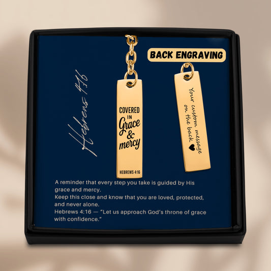 Covered in Grace and Mercy Keychain Engraved Vertical Bar Keychain | Hebrews 4:16 Bible Verse Christian Faith Religious Inspirational Gift Ideas