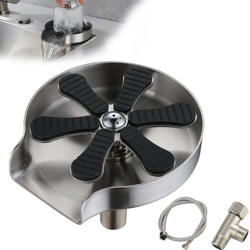 Our sink glass washer works fast and doesn't splash! And the subtle overhang directs the flow of water into the kitchen sink for easy cleanup