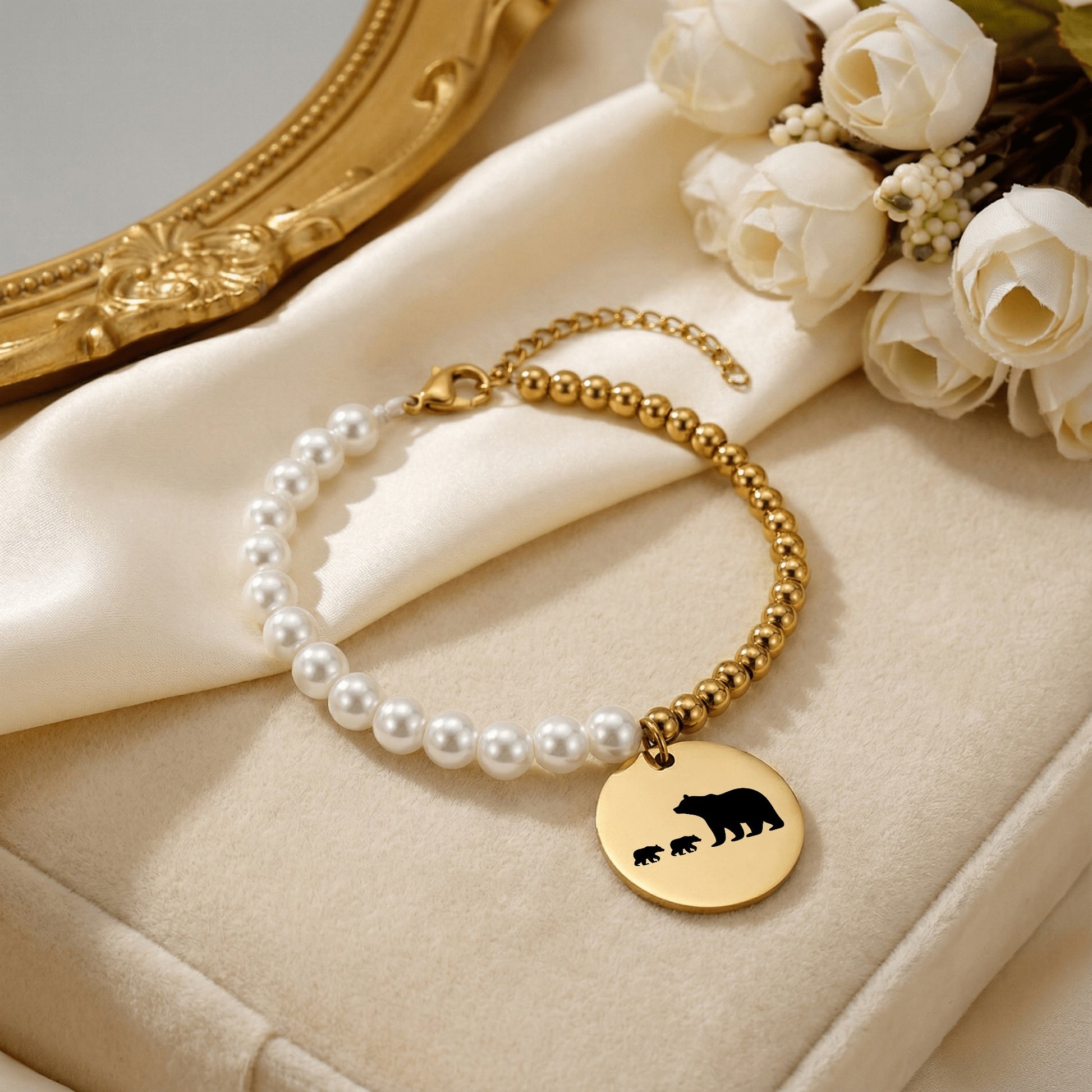 Personalized MAMA BEAR And CUBS Premium Pearl & Gold Coin Bracelet | Gift for Her | Birthday Mother's Day