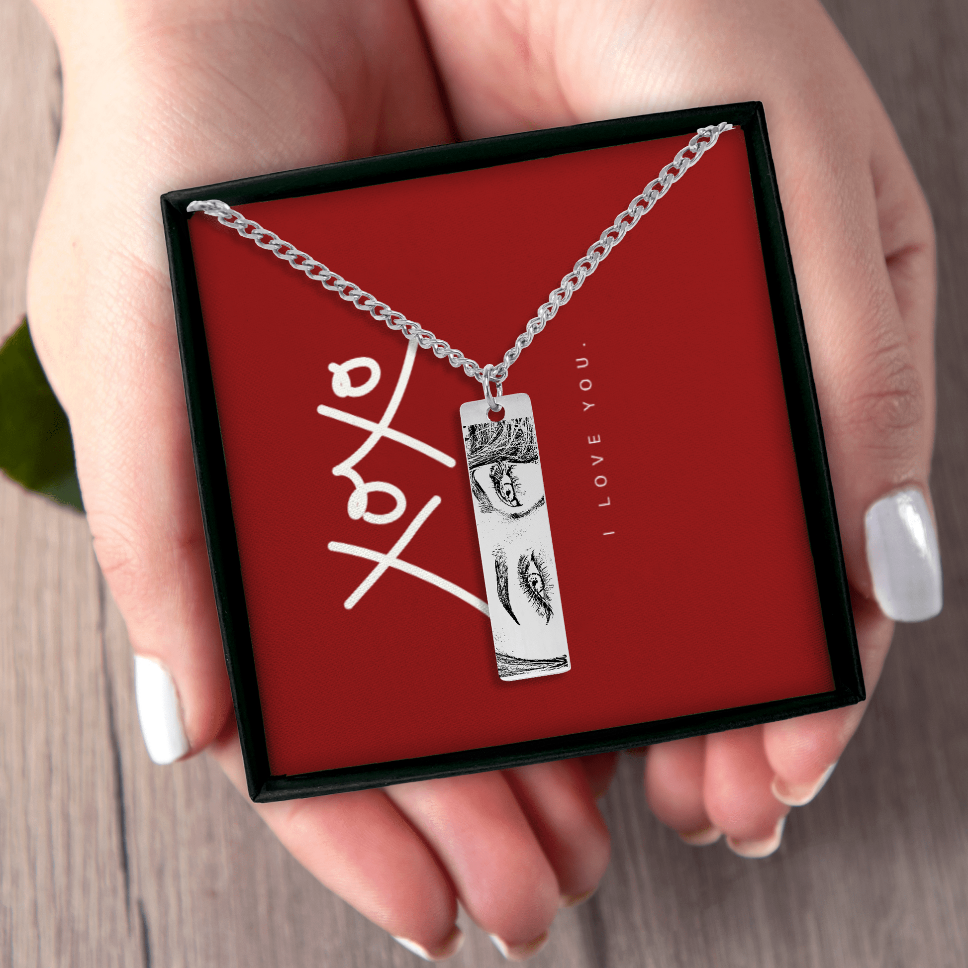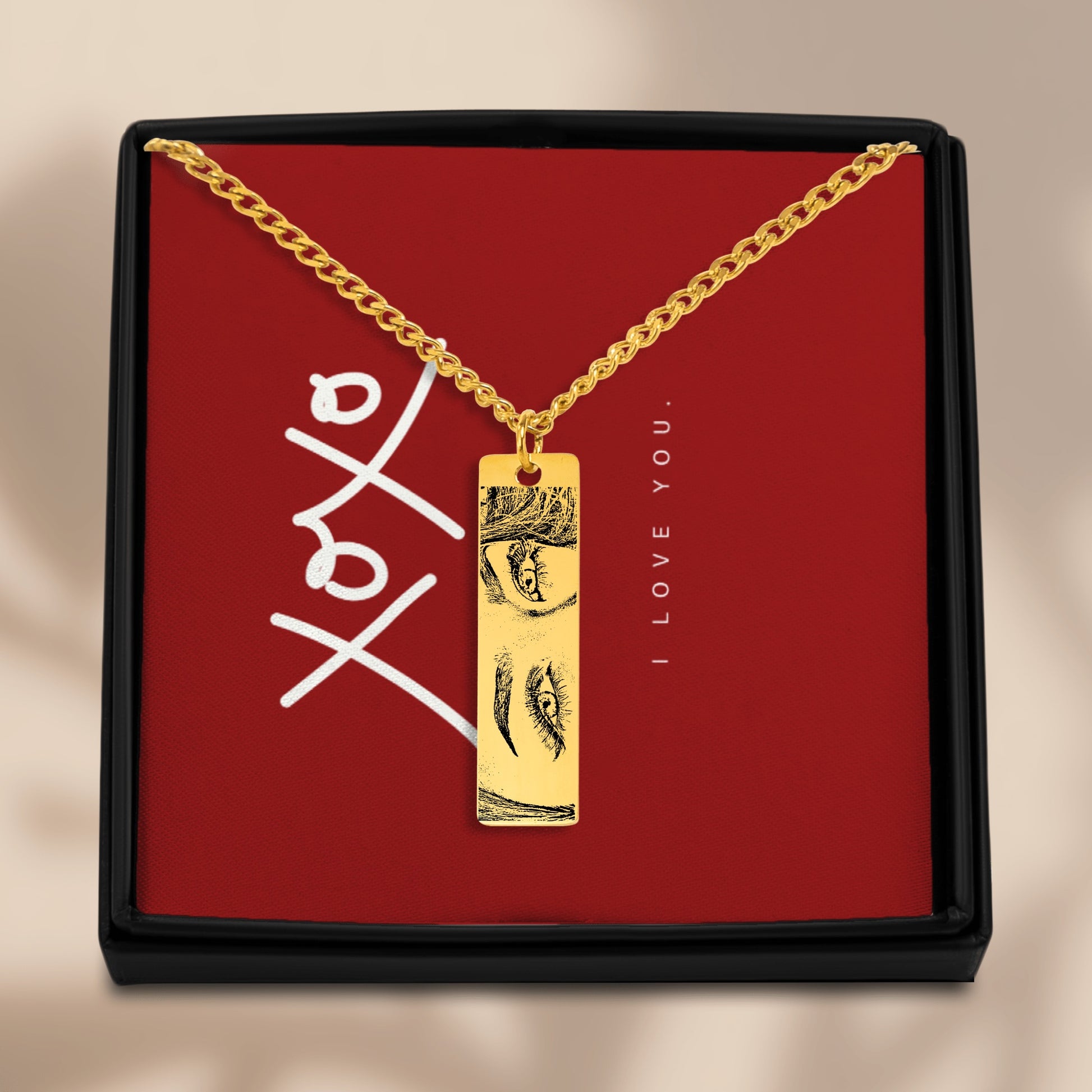 Introducing the Engraved Vertical Bar Necklace, a beautifully personal piece designed to keep the one you love close to your heart — literally. This unique Necklace lets you engrave her eyes his eyes Your eyes on the front of the bar, creating a one-of-a-kind keepsake that’s meaningful, intimate, and unforgettable.