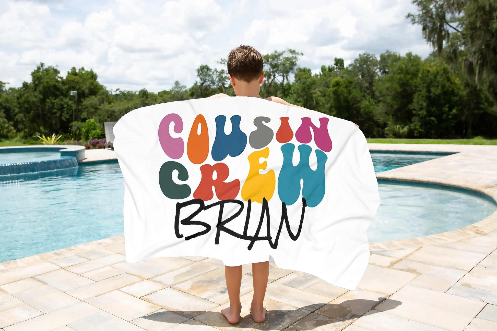 A personalized cousin crew design beach towel perfect for family vacations and beach trips. This towel gives off a fun and playful vibe and is a great way to show off your family pride. Ideal for those who love spending time at the beach with their cousins and creating special memories together. Perfect for summer holidays, family reunions, and beach-themed celebrations.