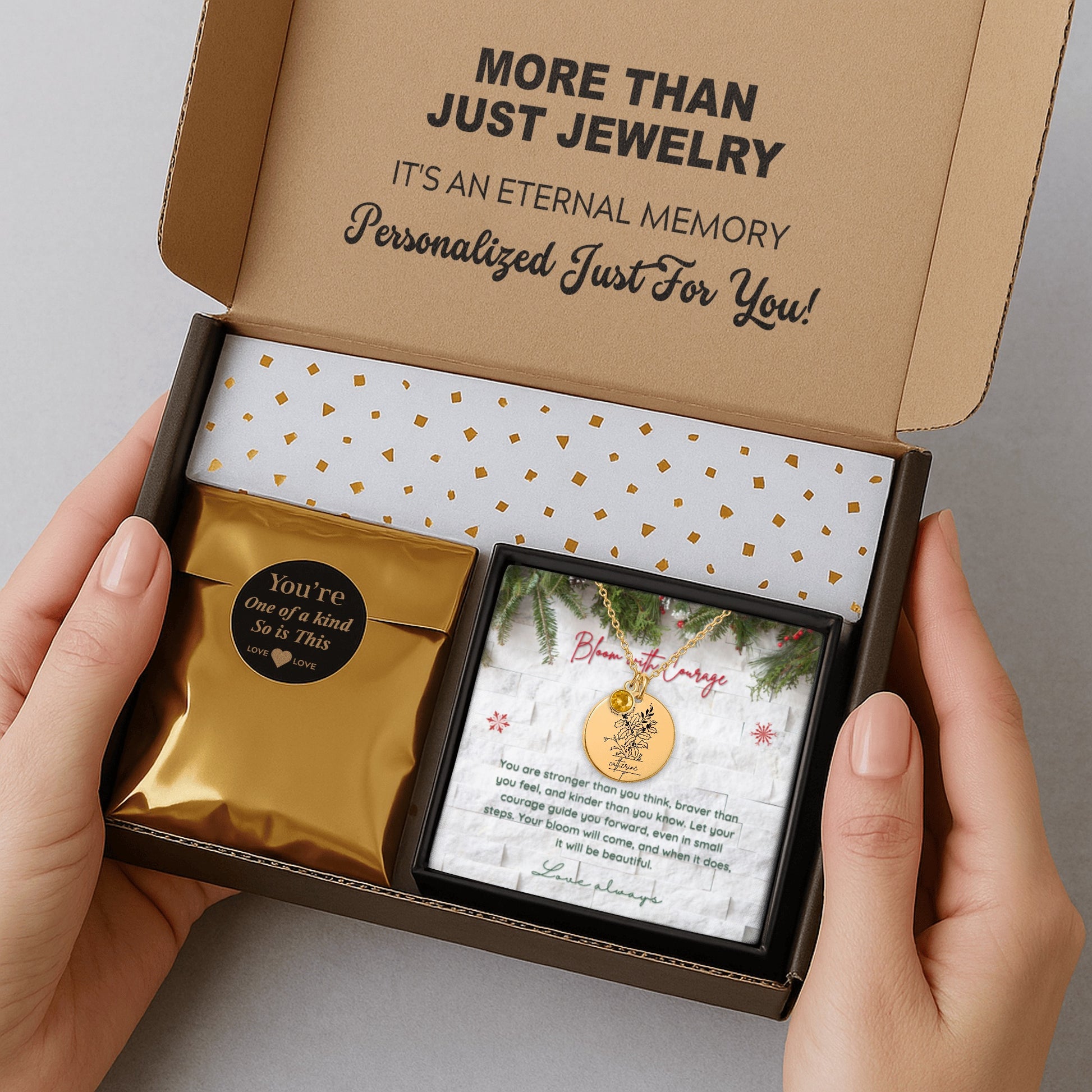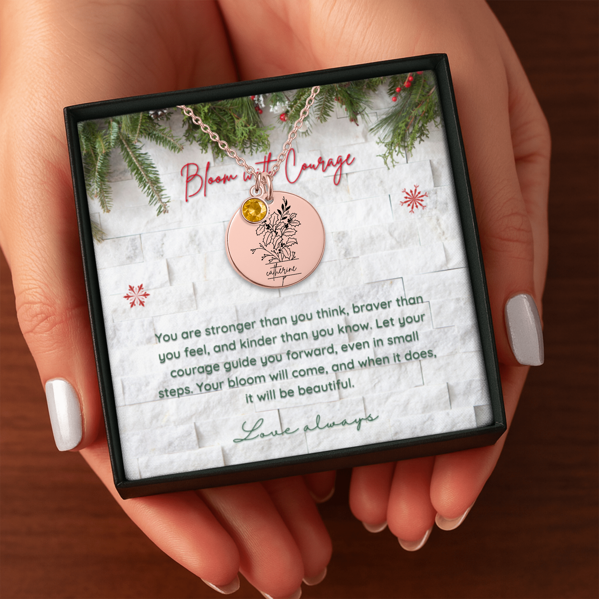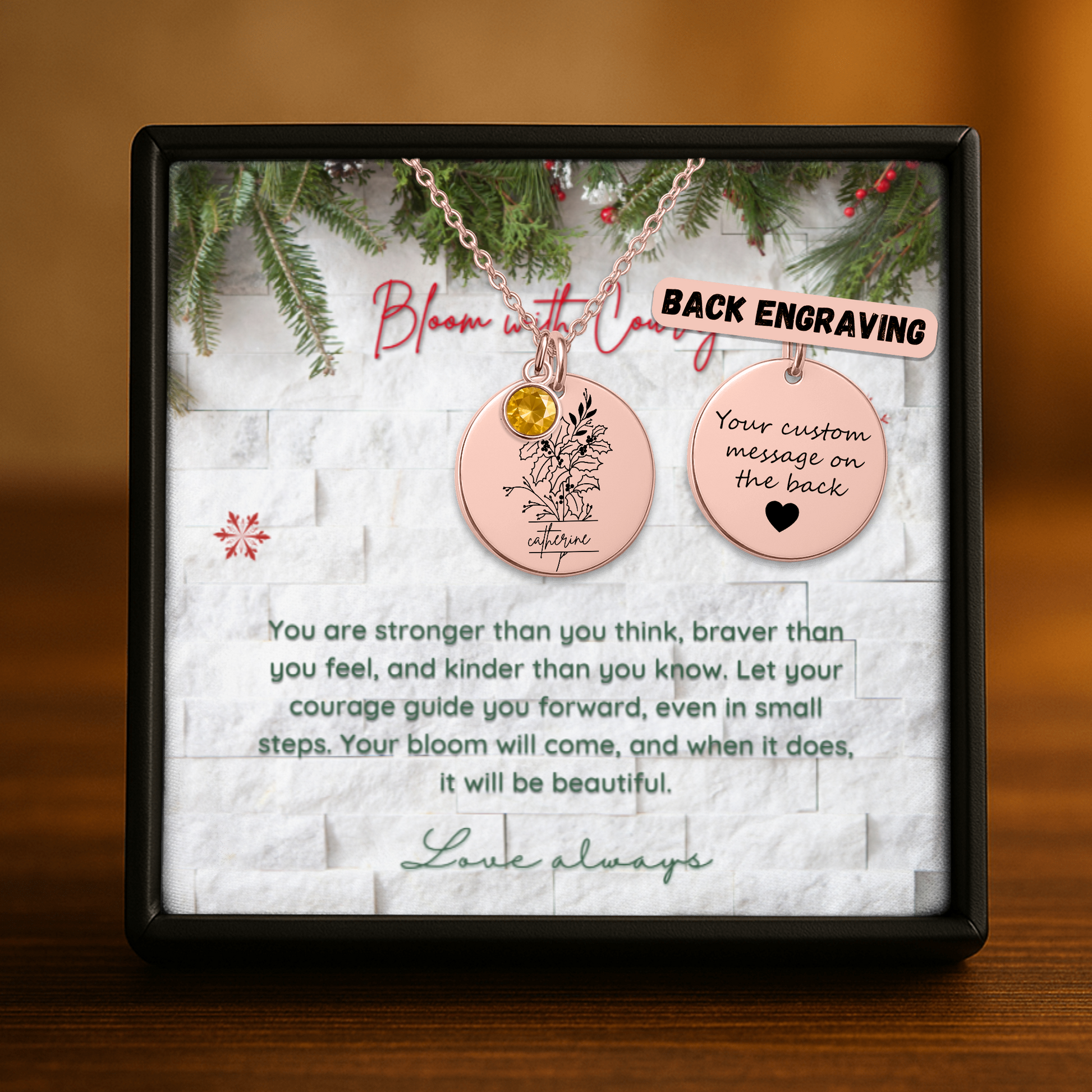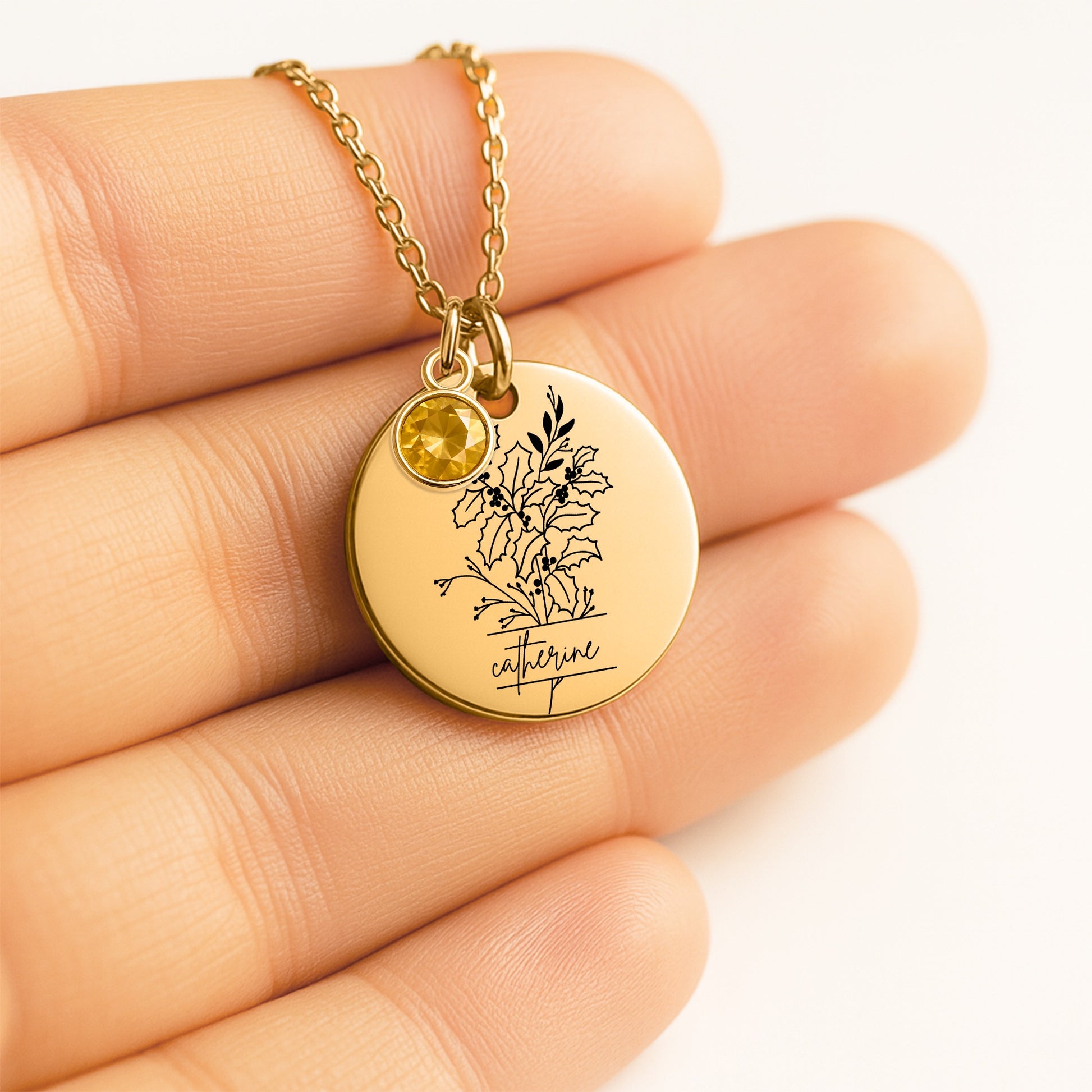 Personalized Name Engraved Floral Coin Necklace with Birthstone Holly & Berries Flower Message Card | Hunting Birthday Christmas Gift Ideas