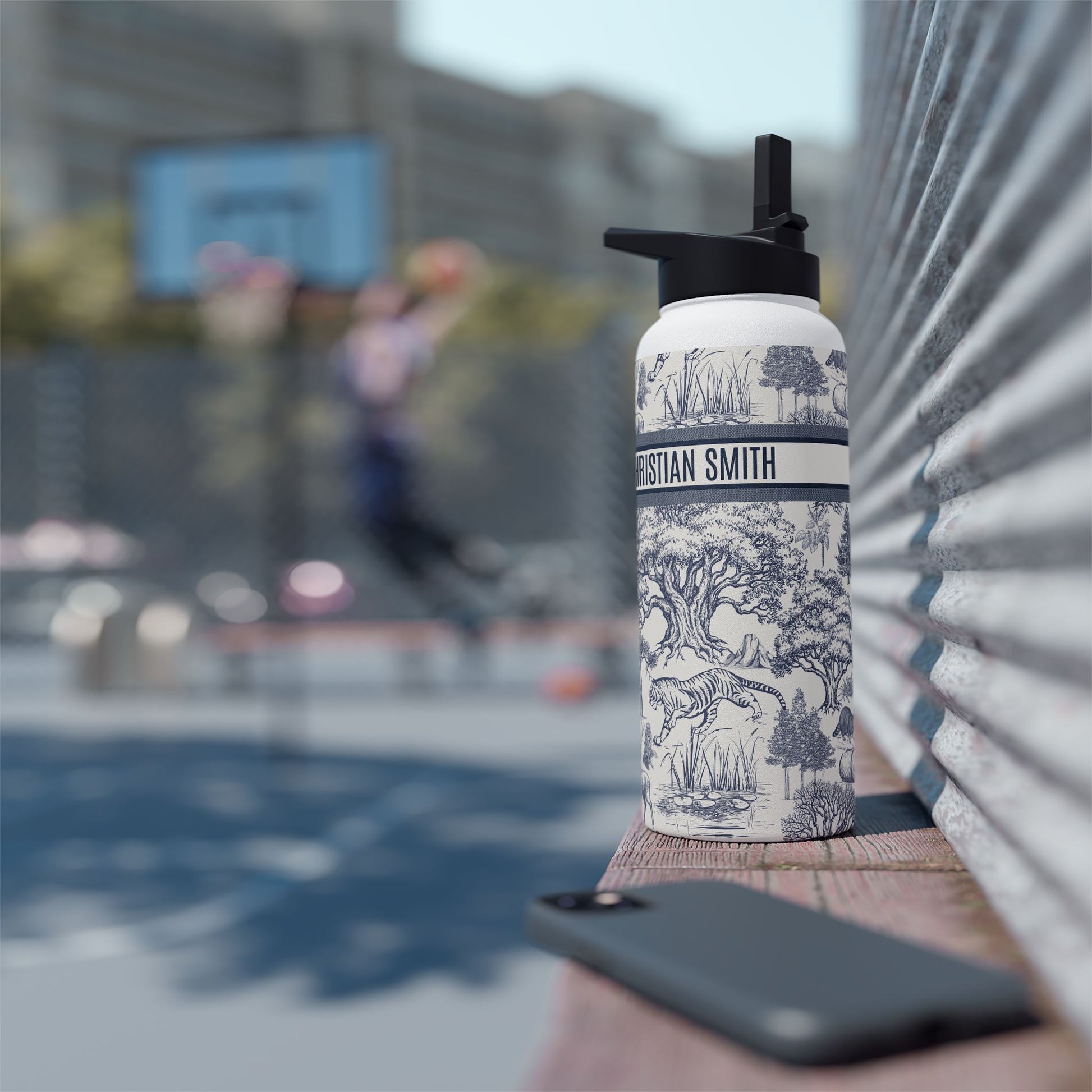 This luxurious vintage-inspired stainless steel bottle features a personalized name on a French nature landscape seamless pattern. Perfect for the fashion-forward individual who appreciates art and style. Ideal gift idea for birthdays, anniversaries, or any special occasion.