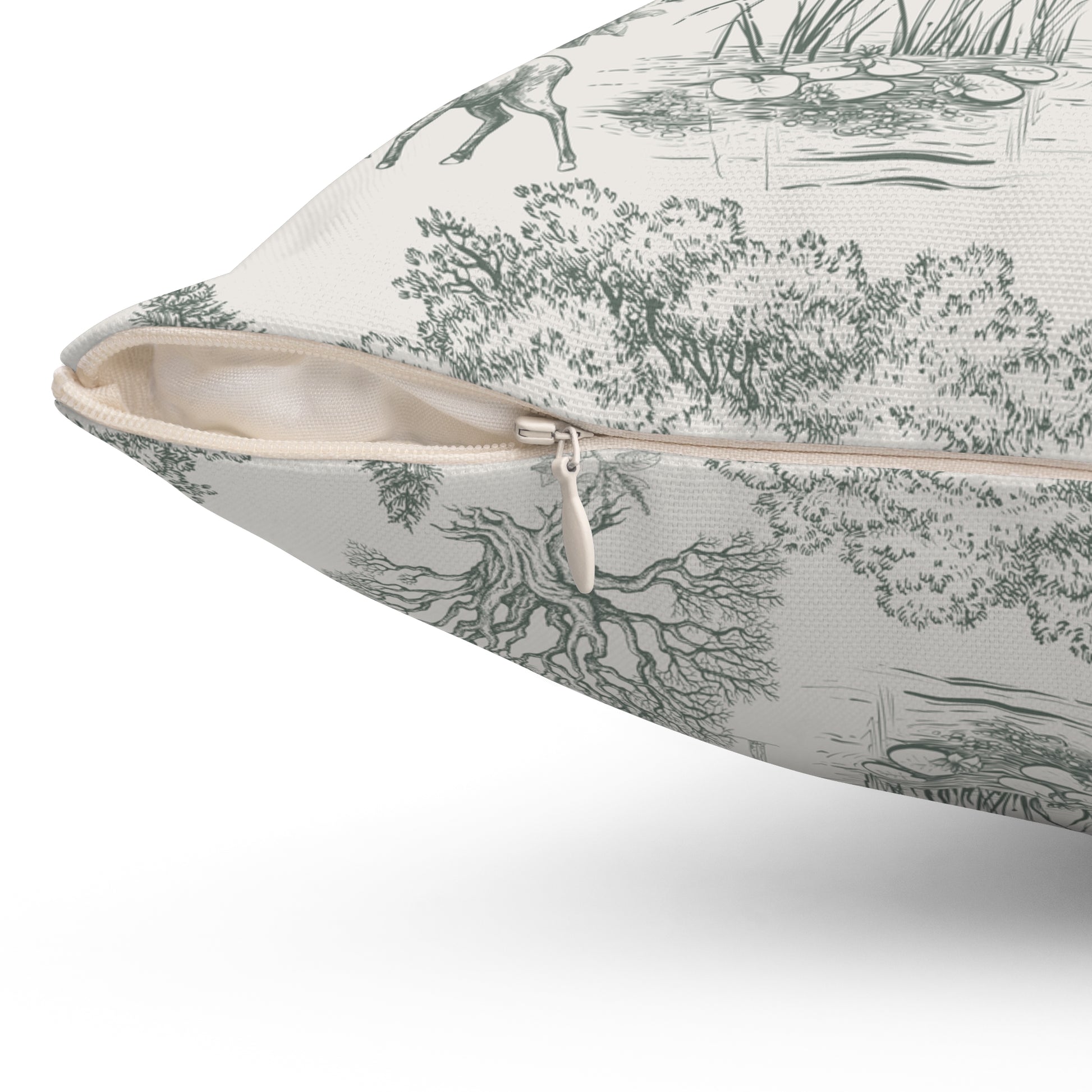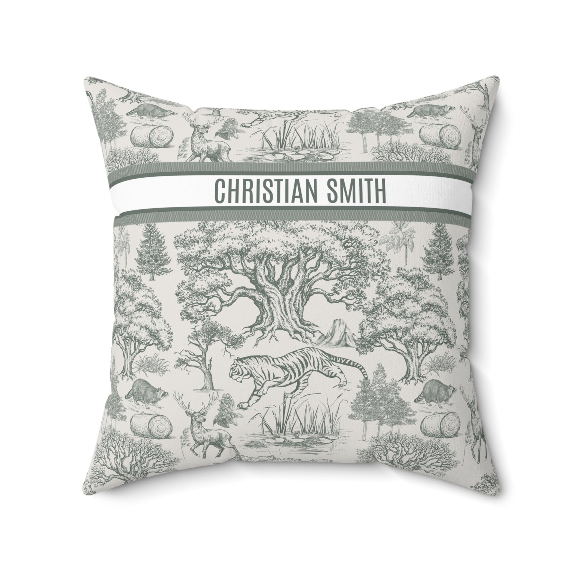 Luxurious personalized square throw pillow featuring a vintage Toile De Jouy French nature landscape seamless pattern. Perfect for adding a touch of elegance to any living room or bedroom decor. Ideal gift for nature lovers and fans of vintage design. Suitable for birthdays, housewarmings, and special occasions.