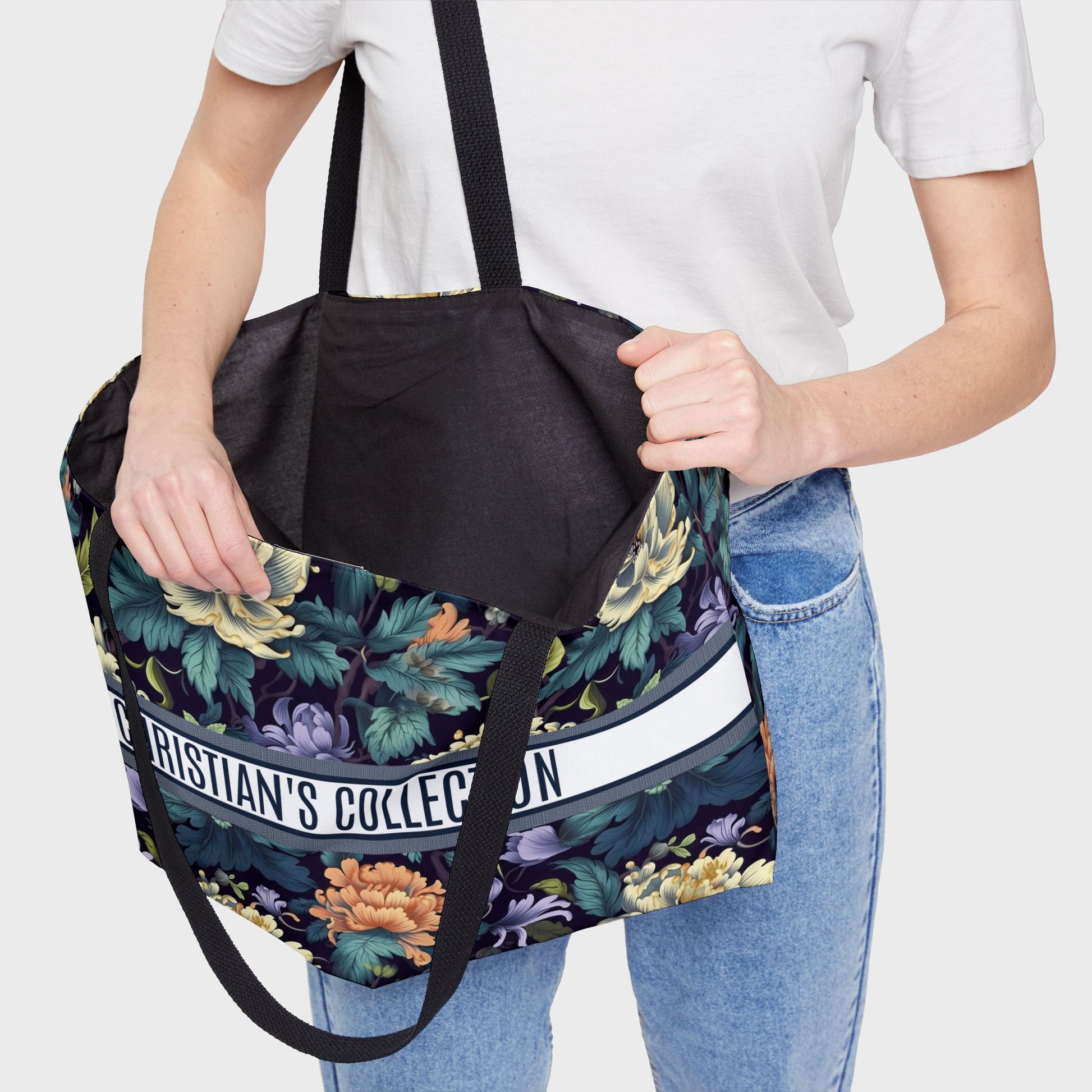Personalized Weekender Tote Bag featuring a Toile De Jouy Seamless Vintage Floral Art design. This vibrant and spacious bag is perfect for weekend getaways, travel, and as a thoughtful gift for group event, birthdays, anniversaries, Christmas, and bridesmaids. The black woven handles make it easy to carry, and the durable spun polyester material ensures it retains its shape without wrinkling.